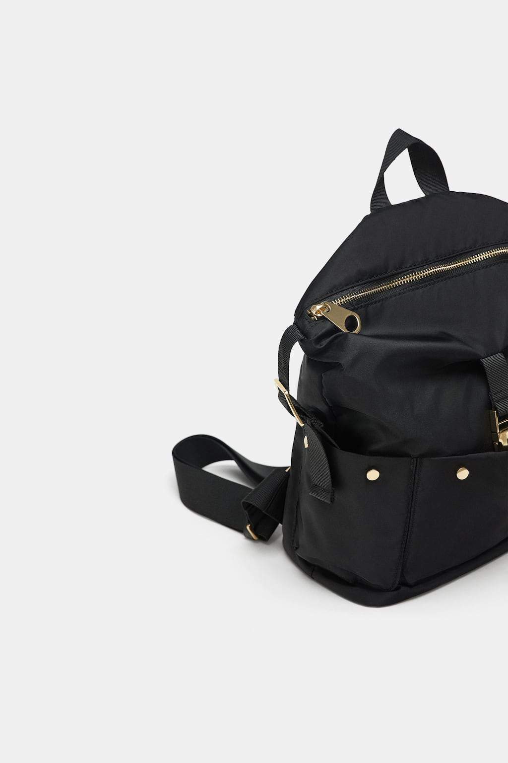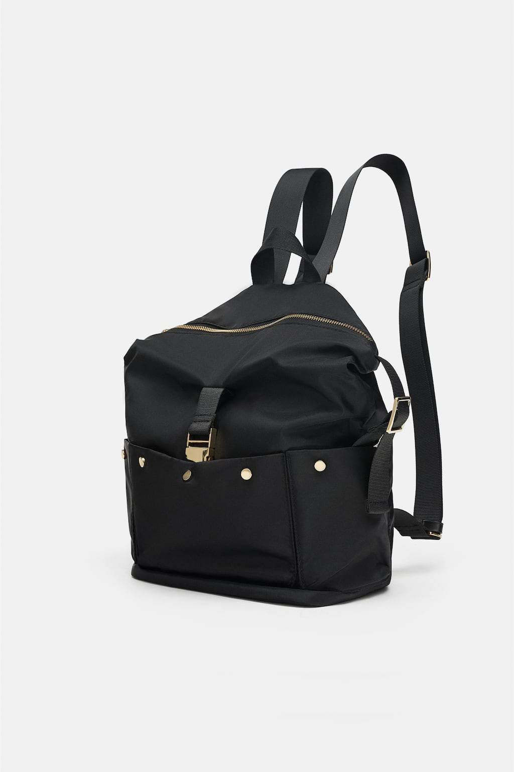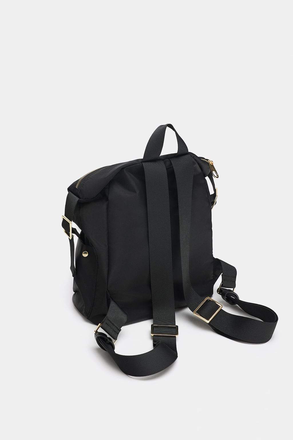Black backpack. Handle and adjustable shoulder strap. Zip closure. Height x Length x Width: 32 x 27 x 32 cm. / 12.5 x 10.6 x 12.5″