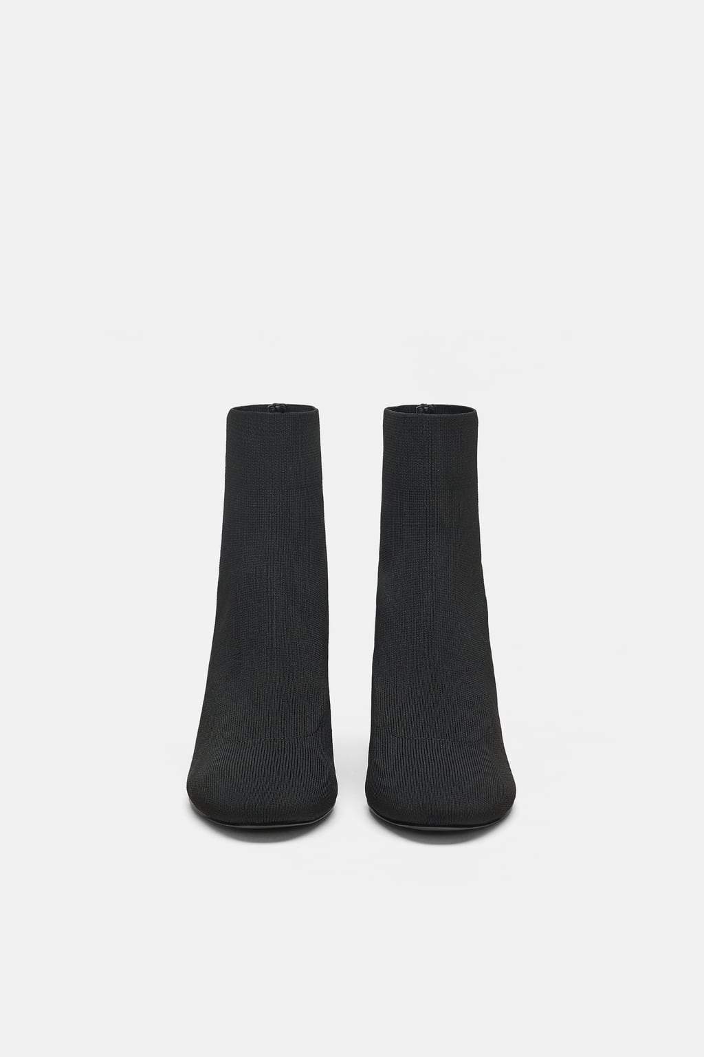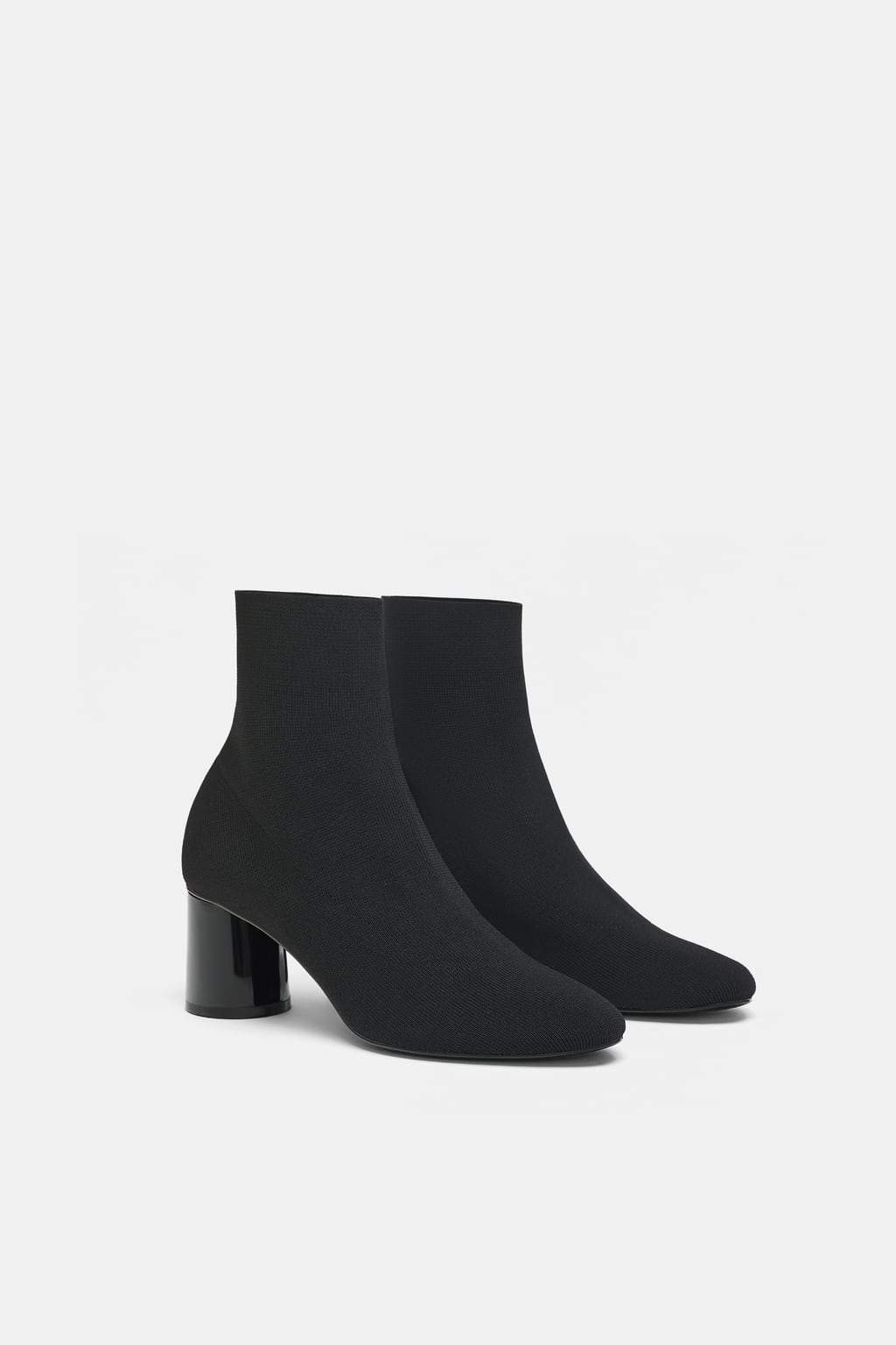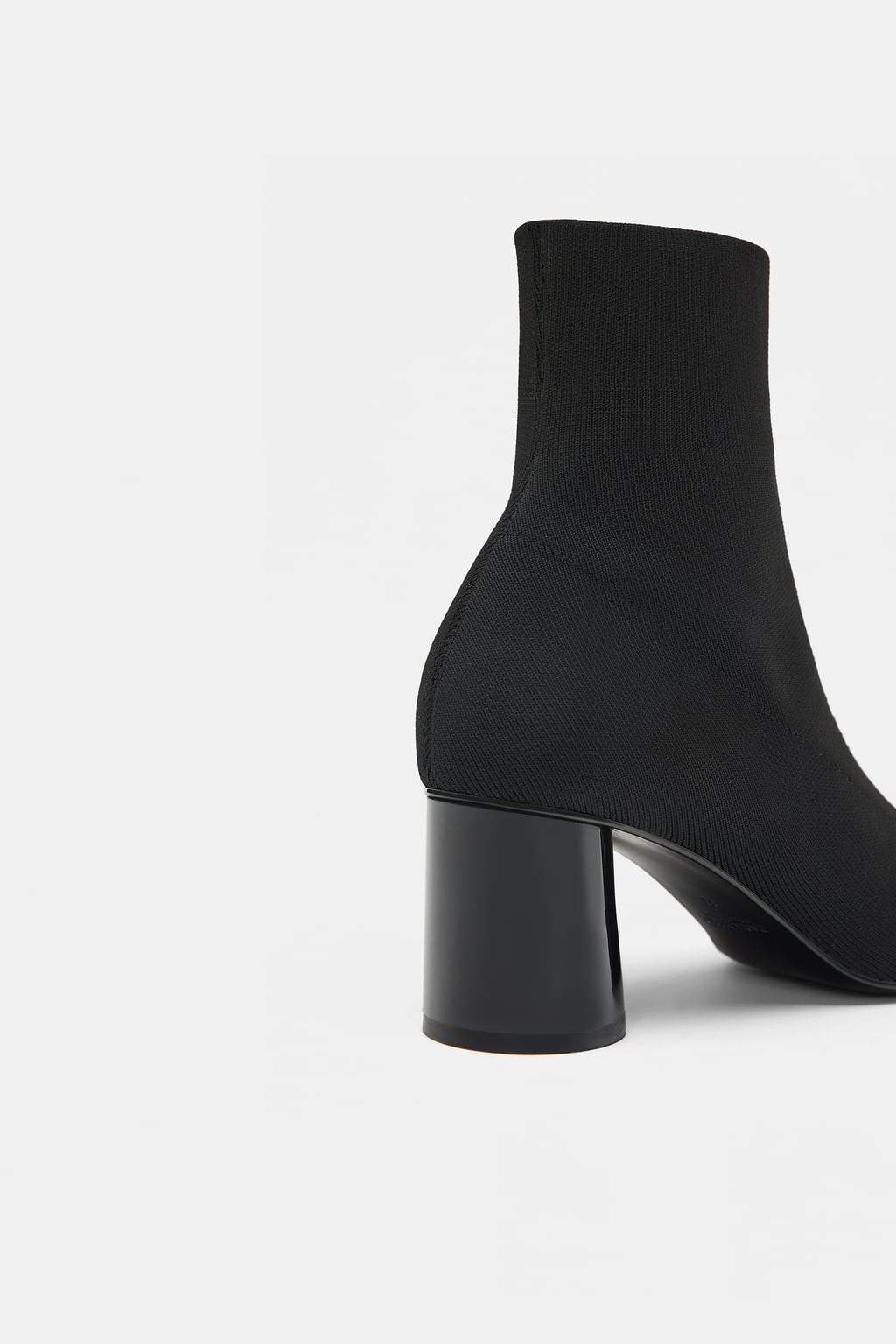 Black high-heel ankle boots. Stretch fabric detail on the upper. Pointed toe. High block heel.